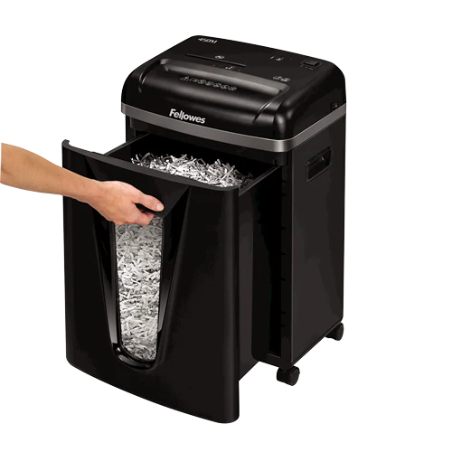 Fellowes 450M is designed with silent shred technology to eliminate loud noises during the shredding operations. The 5.8-gallon pull-out waste bin holds 80% more waste than standard cross-cut shredders. An Auto-Reverse System helps avoid paper overloads, jams and blockages in the feed.