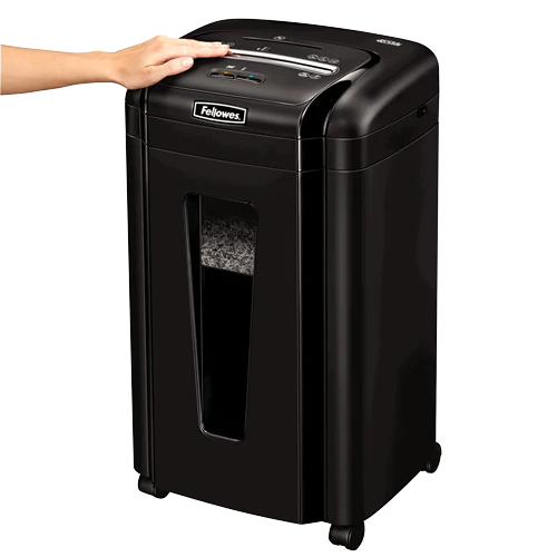 The Fellowes Powershred 465Ms is a 12-sheet micro cut shredder that protects confidential documents by shredding each sheet into 2011 tiny pieces. These micro-cut particles are five times smaller than standard cross-cut shredders, making Fellowes 465Ms a security-level P5 shredder. Powershred 465Ms is designed with a waste bin of 7.5 gallons, and since the micro shreds are so tiny, it can hold 80% more paper per gallon than standard cross-cut shredder bins.