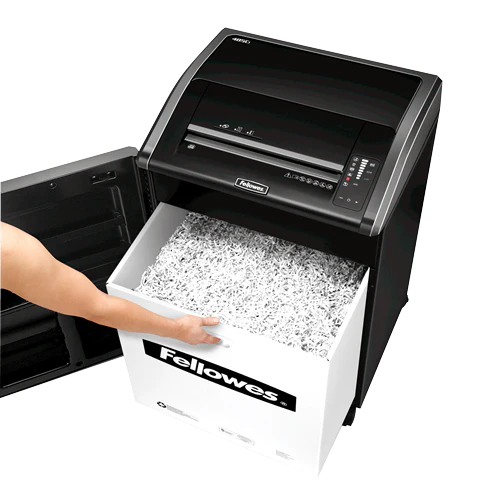 Fellowes 485Ci features an Energy Smart System to ensure 70% low power consumption than conventional paper shredders. Electronic Auto Start & Stop and Anti-jam capabilities enhance efficiency and reduce shredding time. A 35-gallon pull-out bin container with an LED “bin-full” indicator ensures easy waste disposal.