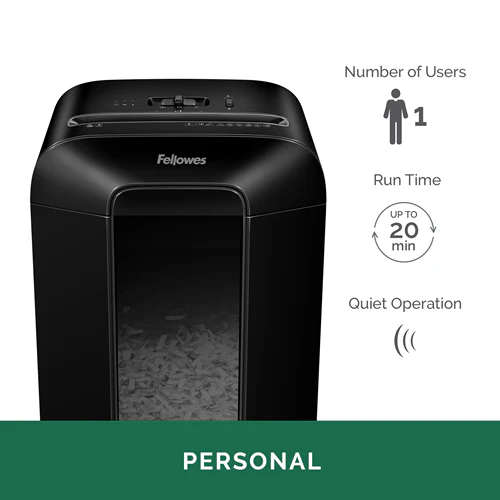 Fellowes LX85 features patented SafeSense Technology to assure safe operations by stopping the whole shredding process when it detects hands near the shredder blades. The professional style blends seamlessly into any setting, making it a great addition to any small or home office.